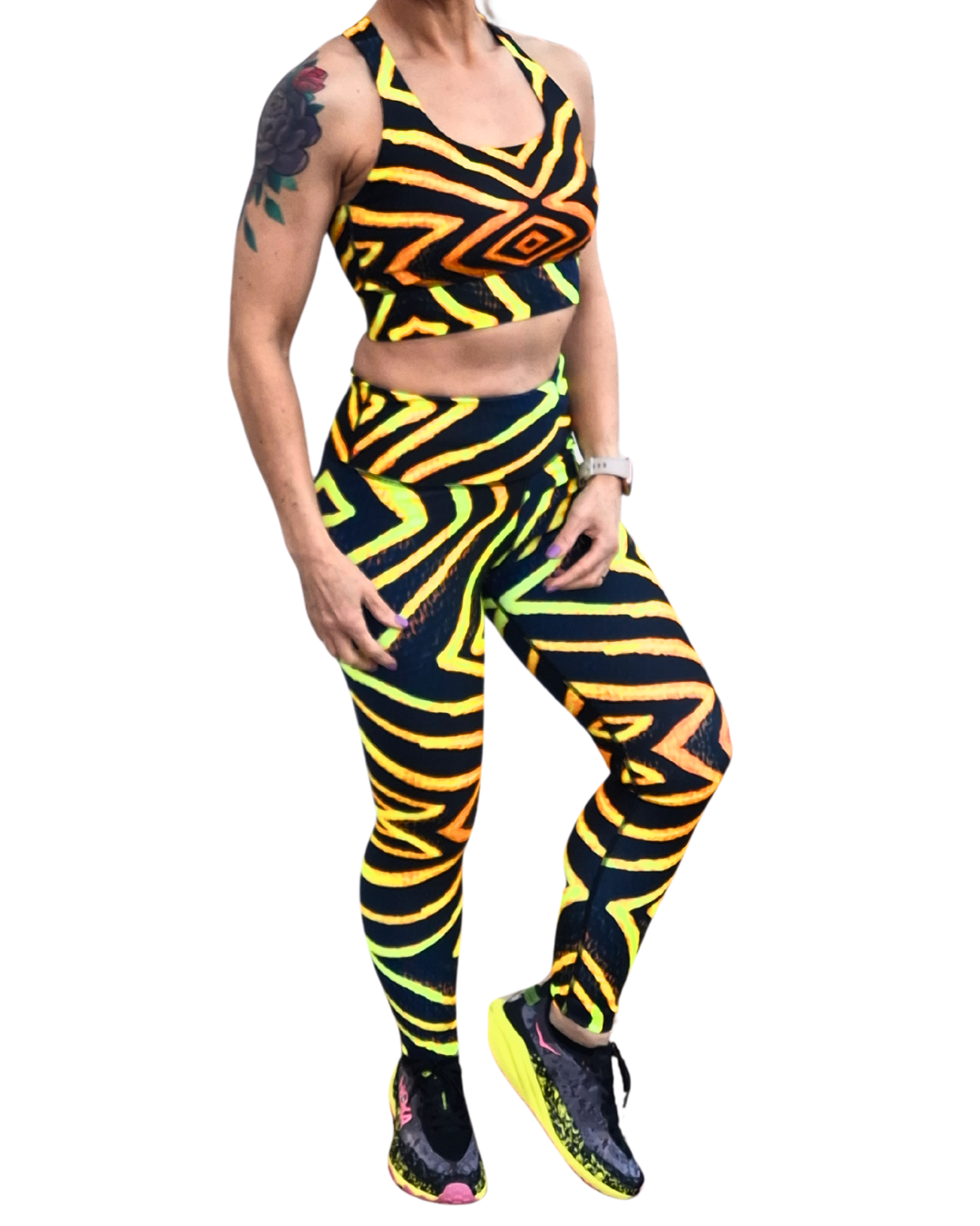 Wild Africa — inspired by bold tribal patterning and high-contrast colour. Electric lines of neon yellow, and warm orange cut through a dark base, creating a striking design that feels strong, energetic, and modern. The pattern comes alive under UV, making it a natural choice for glow fitness, dance workouts, and night sessions.
